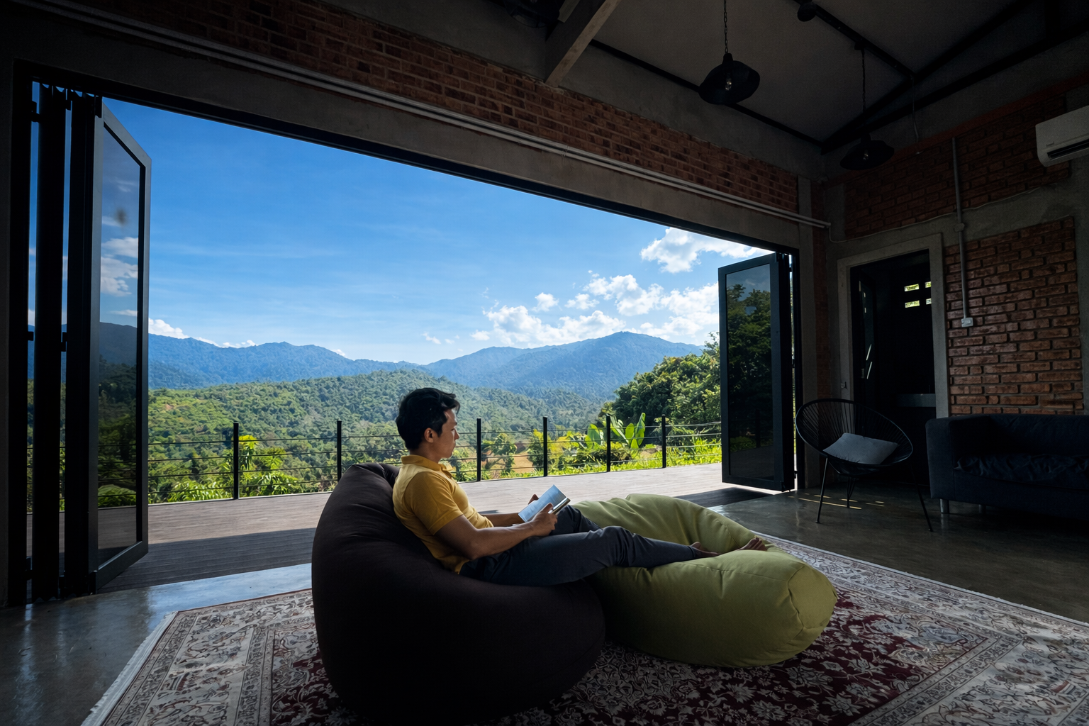 Located in the quaint Kampung Ulu Rening, Batang Kali, Selangor, 82 Rening is a homestay with resort styled facilities. Housing a café, 5 distinct villas and 7 chalet units, it was designed to meet the demands of gathering large family and friends, with nature in the background.