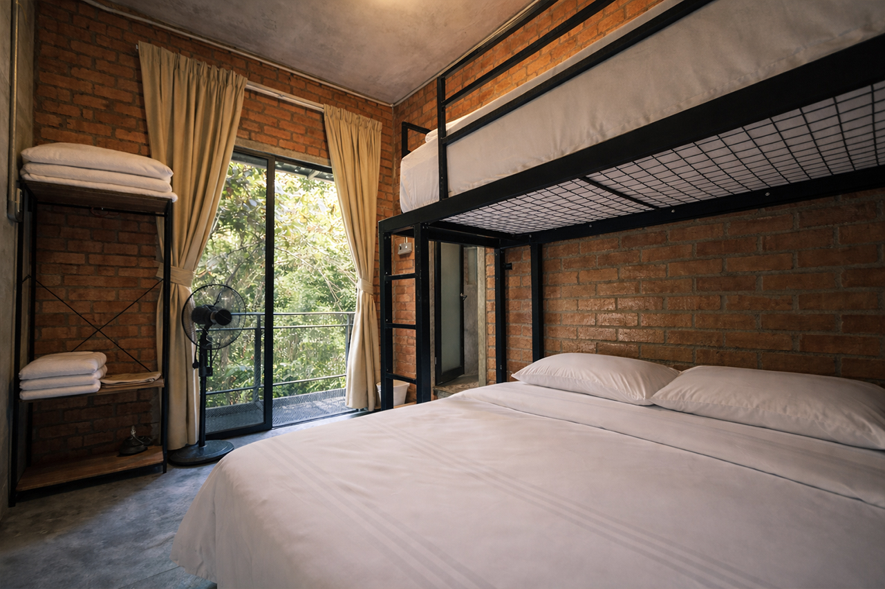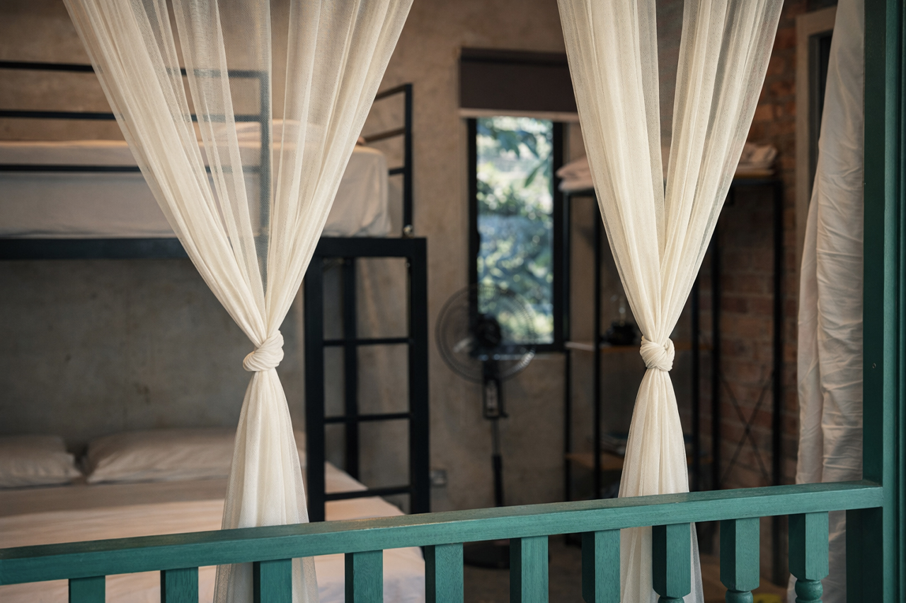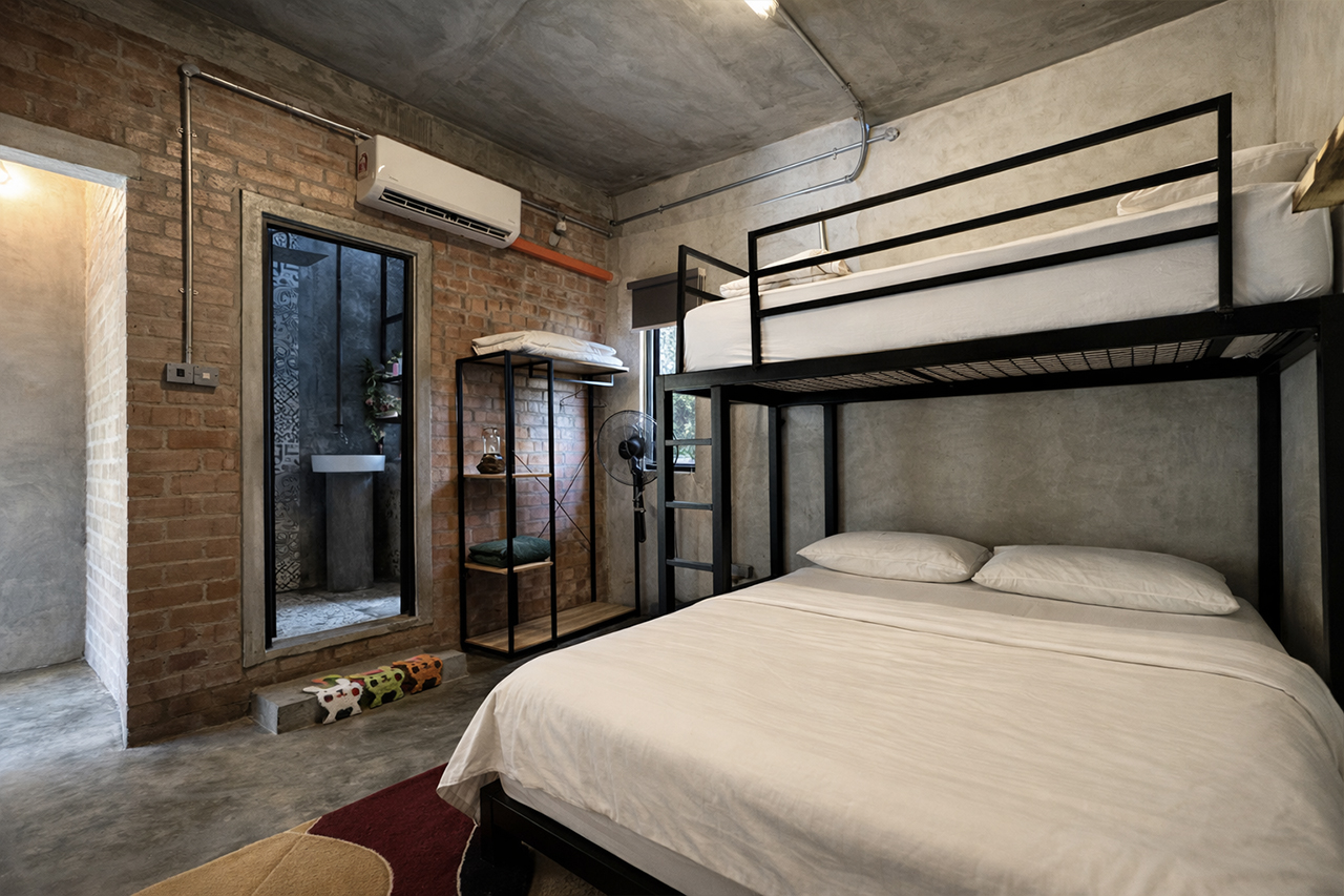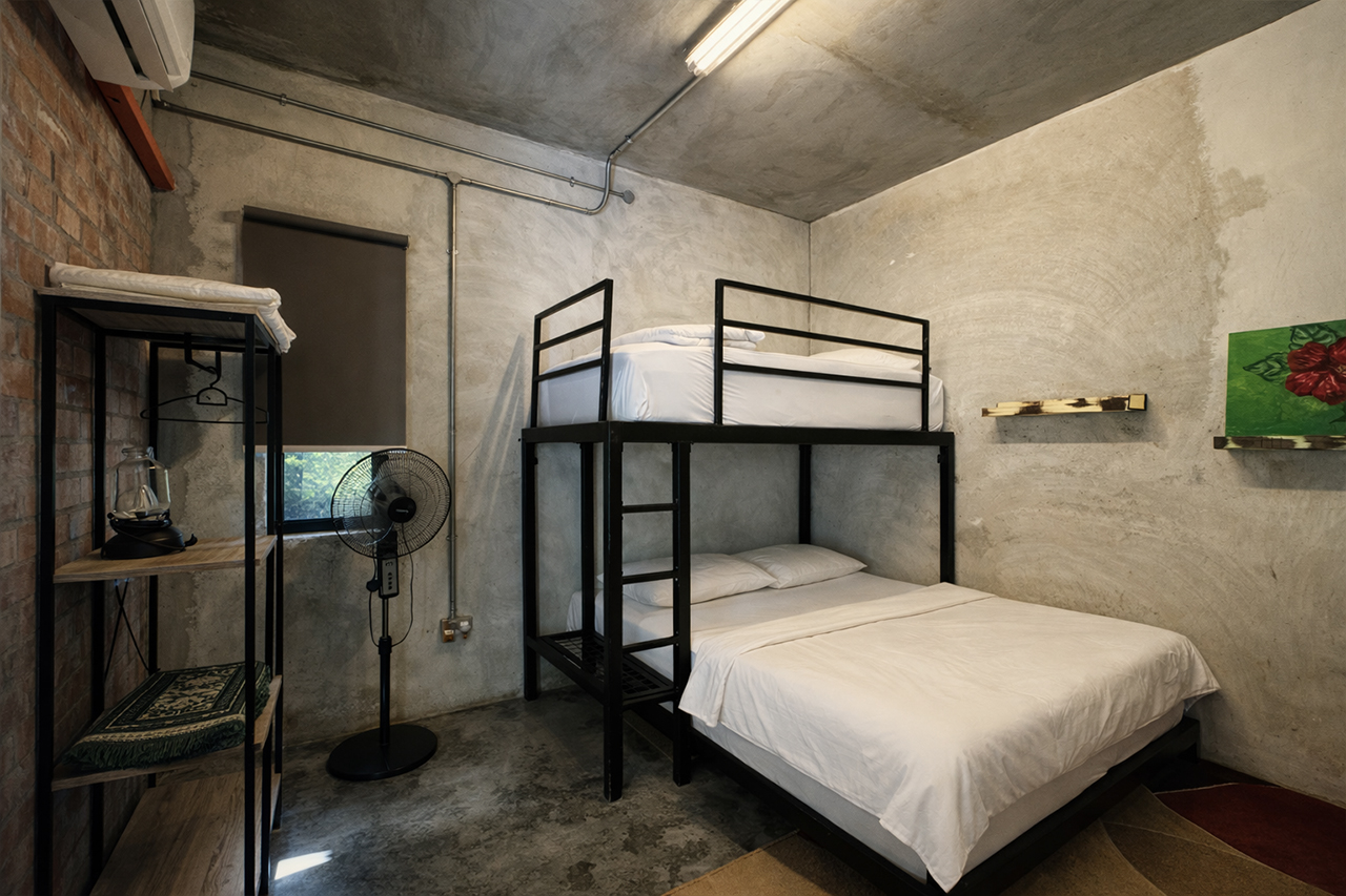 A similarly styled 1,530sq ft double -storey villa with 3 bedrooms. Each room is equipped with a double decker bed – queen bottom and single on top. Rooms also have a single, spare mattress. Sleeps 12 adults comfortably. All bedrooms have attached bath, air-conditioning and stand fans.